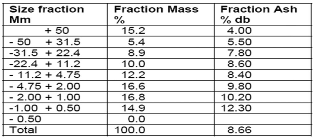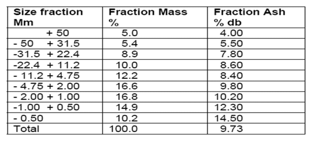 Size fraction mm Fraction Mass (mᵢ) % Fraction Ash (aᵢ) % db |ā – aᵢ| rᵢ