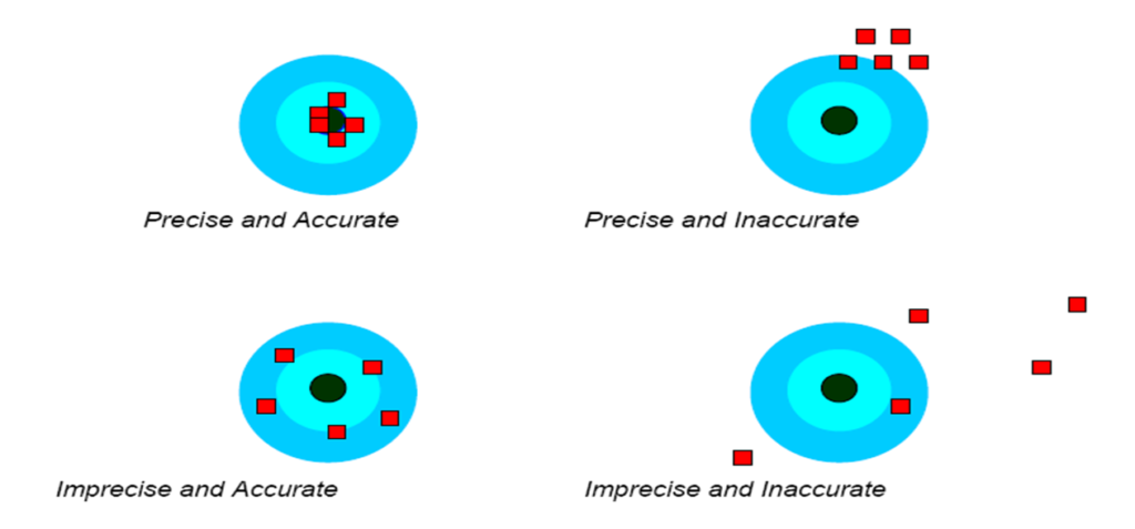 • Precise and Inaccurate (Tepat tapi Tidak Akurat): Hasil-hasil pengujian yang mengelompok, namun jauh dari pusat target.